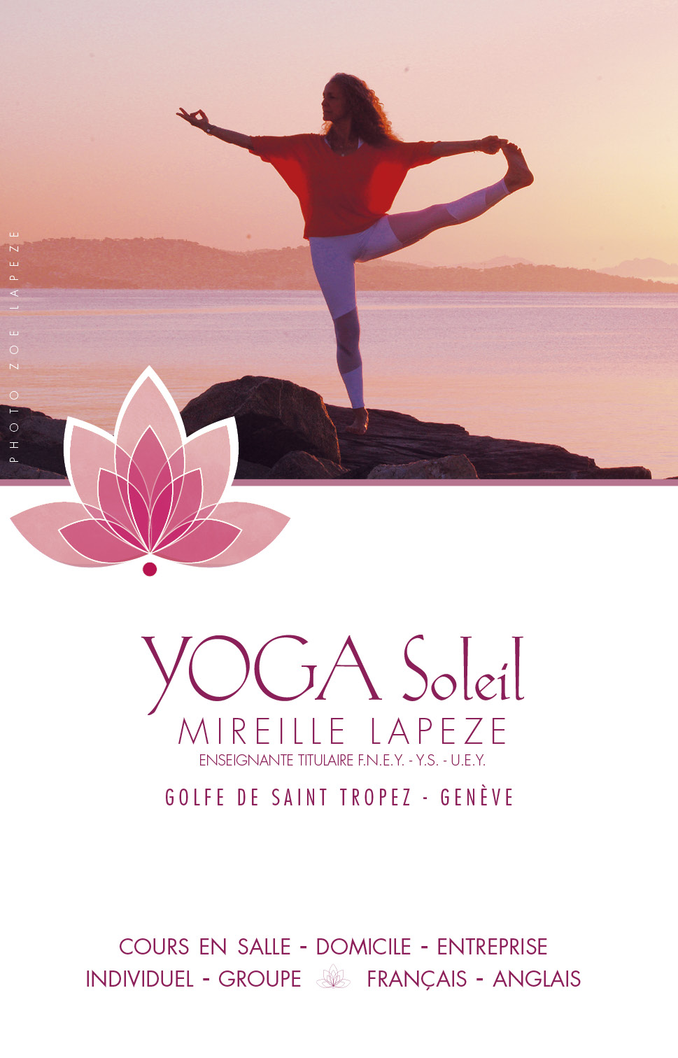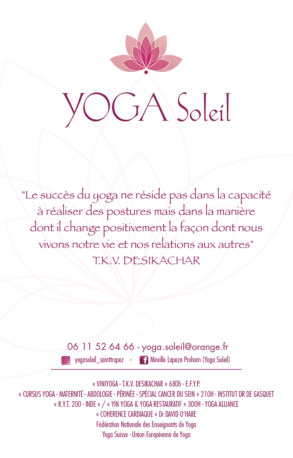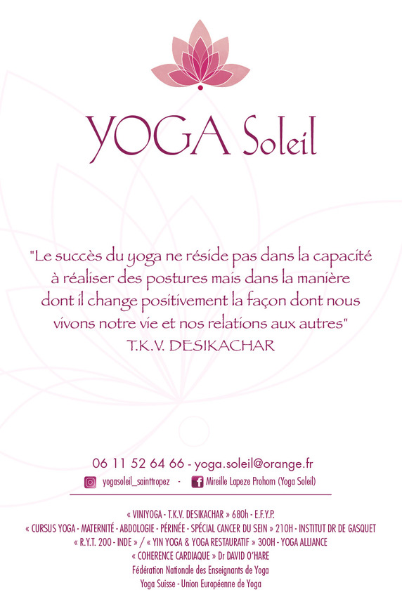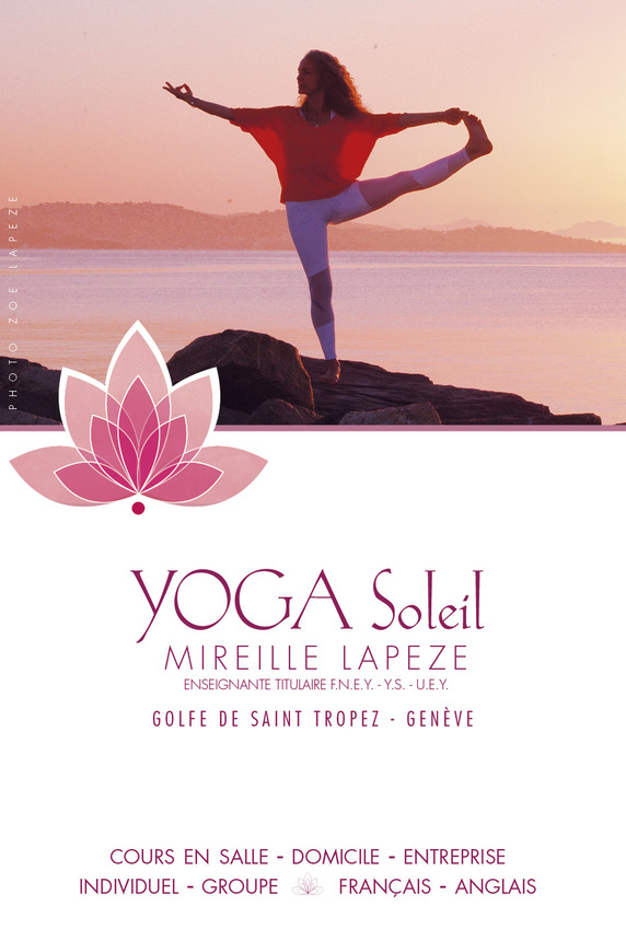 Qualified Yoga Teacher, qualified by the F.N.E.Y. (680h.) (Fédération Nationale des Enseignants de Yoga) endorsed by the U.E.Y. (Union Européenne de Yoga) and qualified teacher recognised by the Y.S. (Fédération Yoga Suisse) endorsed by the U.E.Y. - Certified teacher in "YOGA", "SPORT and MATERNITY - antenatal and postnatal", "ABDOLOGY", "SENIOR YOGA" and "YOGA and BREAST CANCER" at the Institut Dr Bernadette DE GASQUET/Paris (210 hours). - RYT200 (Raja Ashtanga Yoga Teacher Training / Pushkar Meditation Temple / Rajasthan-INDE) / YOGA ALLIANCE (200h.) - YIN YOGA - RESTAURATIVE YOGA - DRAGON DANCE with Cécile Roubaud and Valentina Duna / Post Formation YACEP / YOGA ALLIANCE (100h.) - CARDIAC COHERENCE Practitioner / Institut de Formation EQUILIBIOS I.F.E.D.O. under the guidance of Dr David O'HARE (21h) - Trained in Mindfulness Meditation under the guidance of J.-M. DANCE / M.B.S.R. Jon KABAT ZINN (35h) Indoor classes : - TUESDAY from 12.45pm to 2pm at the Cirque PAD in Sainte-Maxime - WEDNESDAY from 8am to 9am at the Gym Addict in Cogolin - WEDNESDAY from 19:30 to 20:45 at the Gym Addict in Cogolin - THURSDAY from 8.15am to 9.30am at the Gym Addict in Cogolin - THURSDAY from 12.45pm to 2pm at the Cirque PAD in Sainte-Maxime