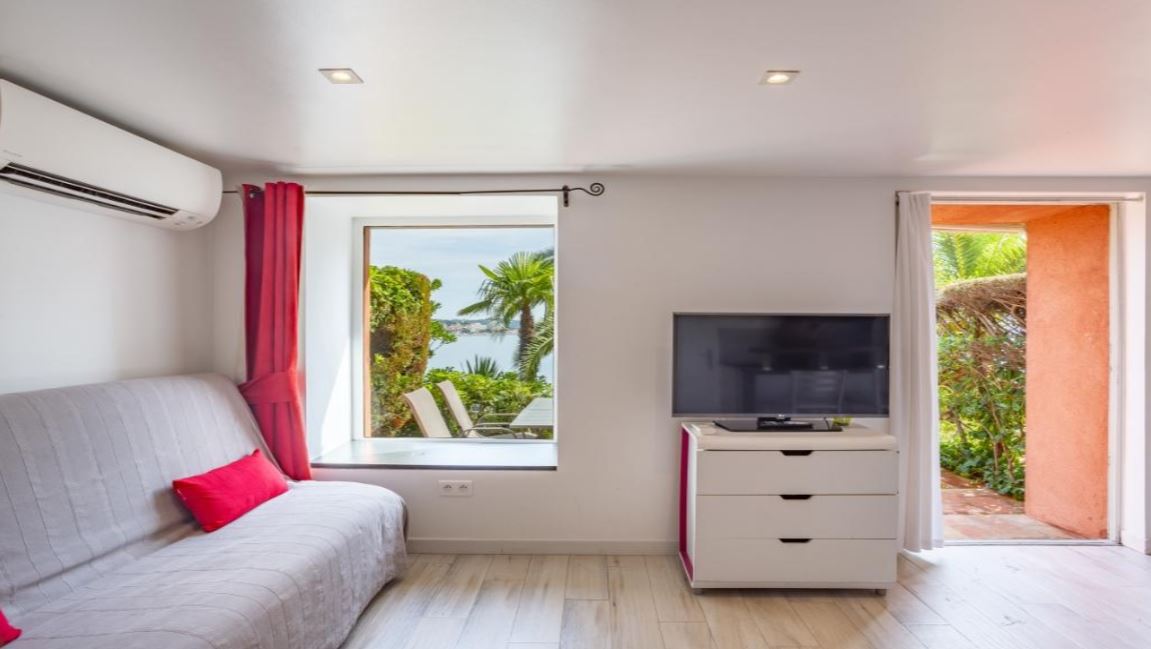 Lou Trelus vous offre un panorama unique sur la mer et un grand parc provençal arboré. A 50 mètres d'une plage de sable fin publique et privée, elle se situe à proximité du tennis club, golf, et un club nautique.