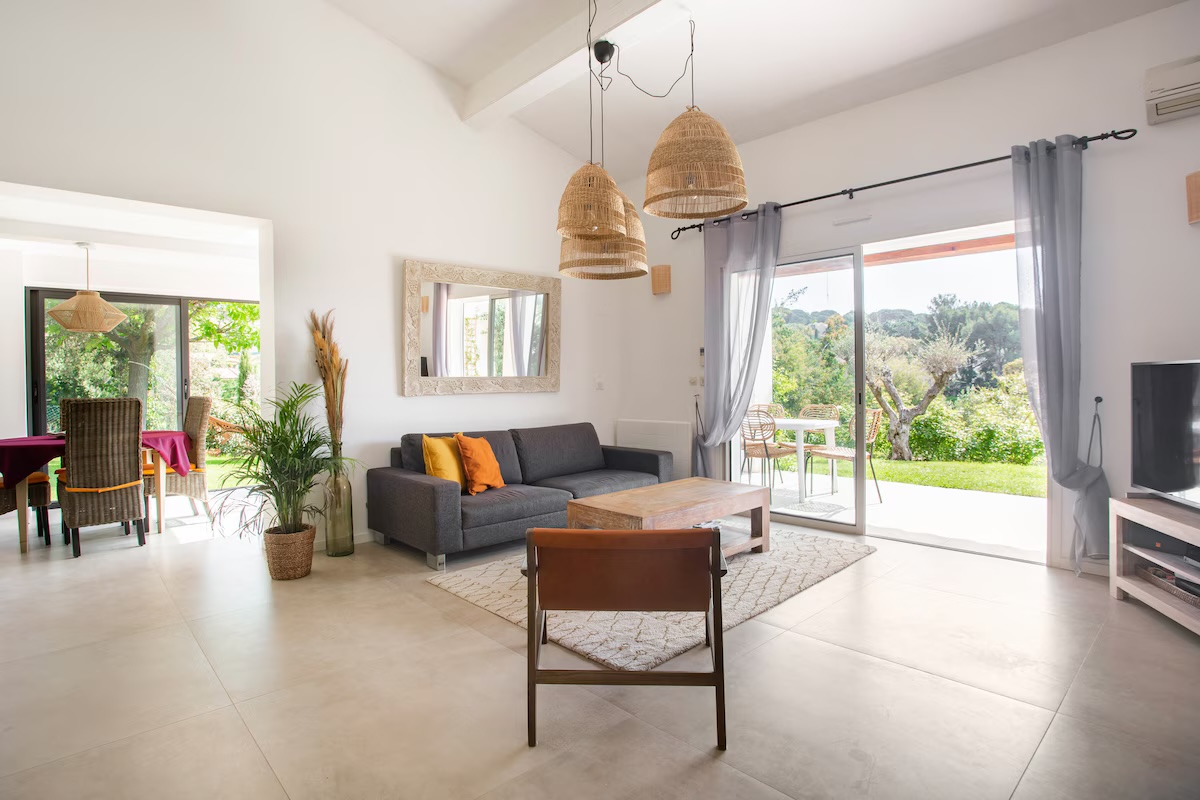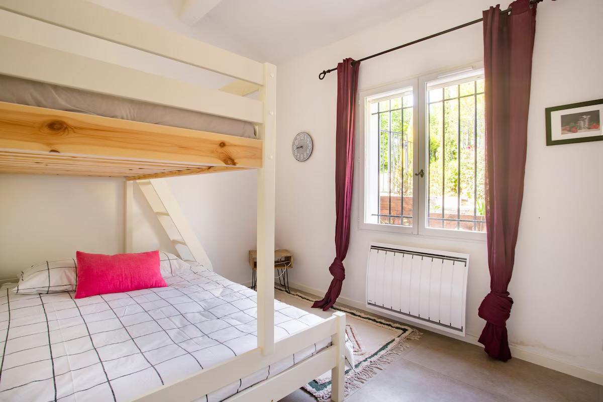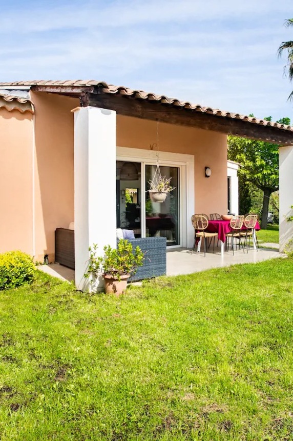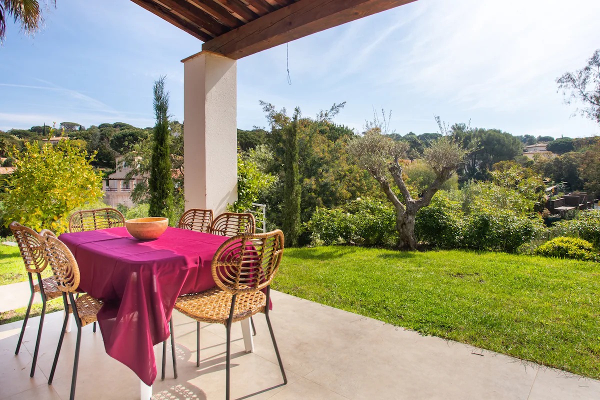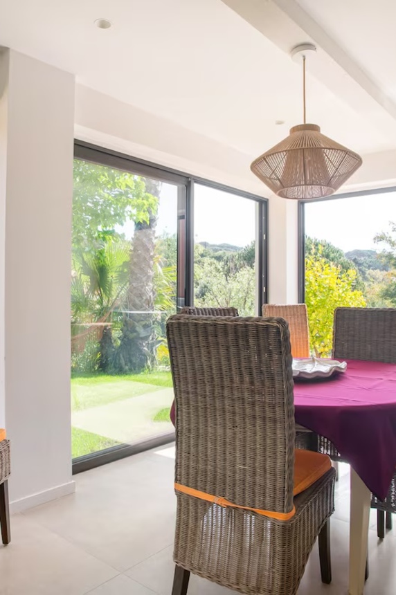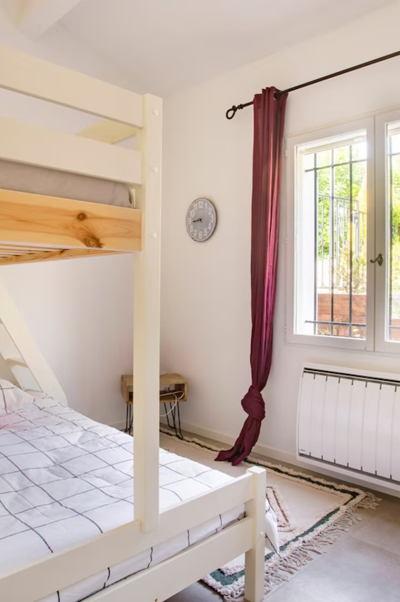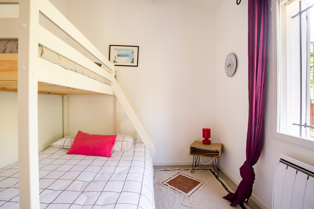 Cette maison familiale rénovée se trouve à Sainte-Maxime, au cœur du golfe de Saint-Tropez. Conçue avec mon père, décorateur d'intérieur, comme un lieu confortable, lumineux et fonctionnel, elle est parfaite pour des vacances en famille ou entre amis. Ses espaces de vie sont spacieux et lumineux. La maison est entièrement climatisée et très lumineuse. Elle dispose d'un grand séjour de 55 m² agréable et convivial, ouvert sur une véranda donnant sur un jardin fleuri. Le mobilier est confortable et adapté aux longs séjours. La cuisine ouverte, organisée autour d'un îlot central, est entièrement équipée. - four et plaque à induction ; - cafetières, bouilloire, grille-pain ; - un robot de cuisine et de nombreux accessoires ; Une terrasse extérieure permet de prendre ses repas dehors et un barbecue Weber est à disposition. Les chambres et la salle de bains La maison offre 5 couchages : - la chambre principale (12 m²) avec un lit queen size (160 x 200), lumineuse et offrant une vue sur le jardin ; - une deuxième chambre (10 m²) avec un lit double superposé (140 x 200 + 90 x 200), idéale pour les enfants ou les invités ; La salle de bains moderne dispose d'une grande douche. Le linge de lit et les serviettes sont fournis. Le jardin et la piscine sont à votre disposition. Le jardin de plus de 300 m², arboré d'oliviers, de palmiers et de citronniers, est parfait pour les familles et les animaux de compagnie. La piscine partagée de la résidence, située à moins de 20 mètres, est très calme (résidence de dix maisons environ). Elle est ouverte toute l'année et praticable de mai à octobre. Elle dispose d'une zone peu profonde adaptée aux enfants. Équipements pour la famille et les loisirs : - équipements pour bébé : lit parapluie, baignoire, table à langer, chaise haute ; - Wi-Fi fibre ; - un espace de travail avec écran et clavier (télétravail) ; - une place de parking abritée et un parking public à proximité ;