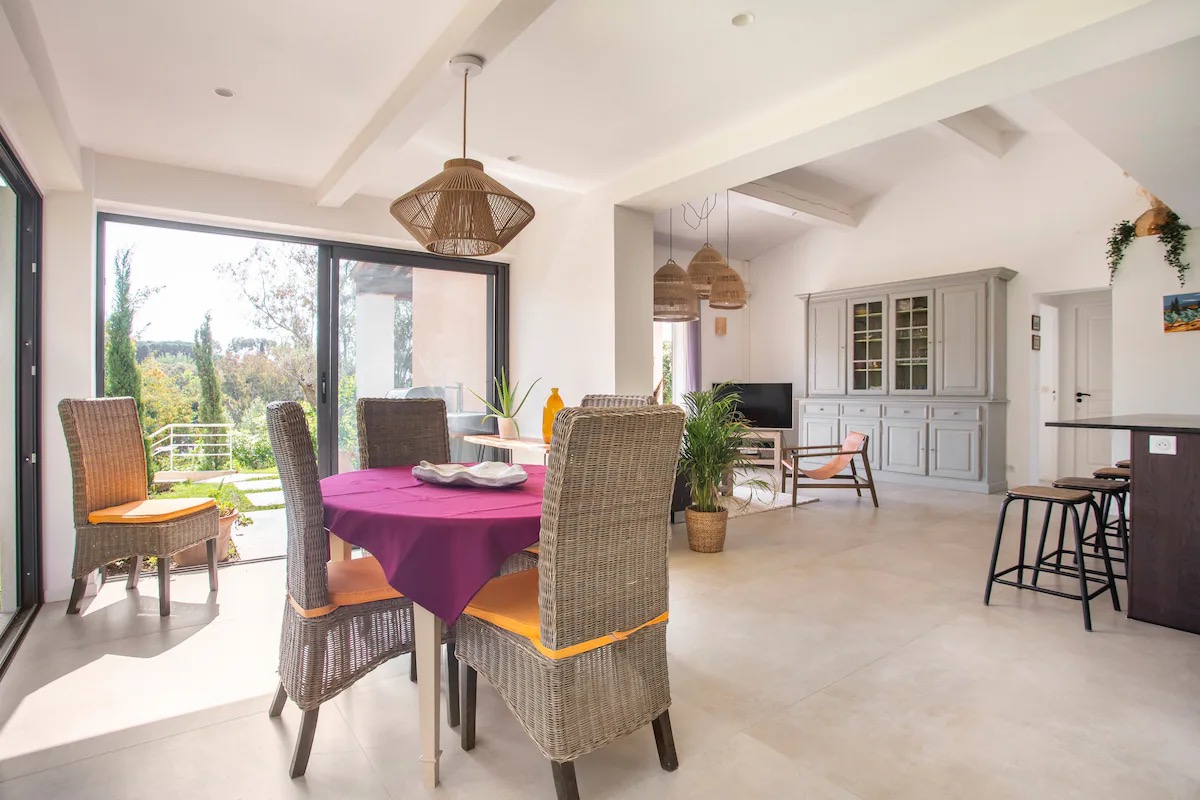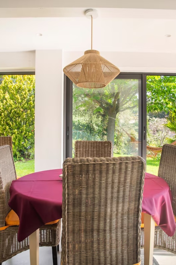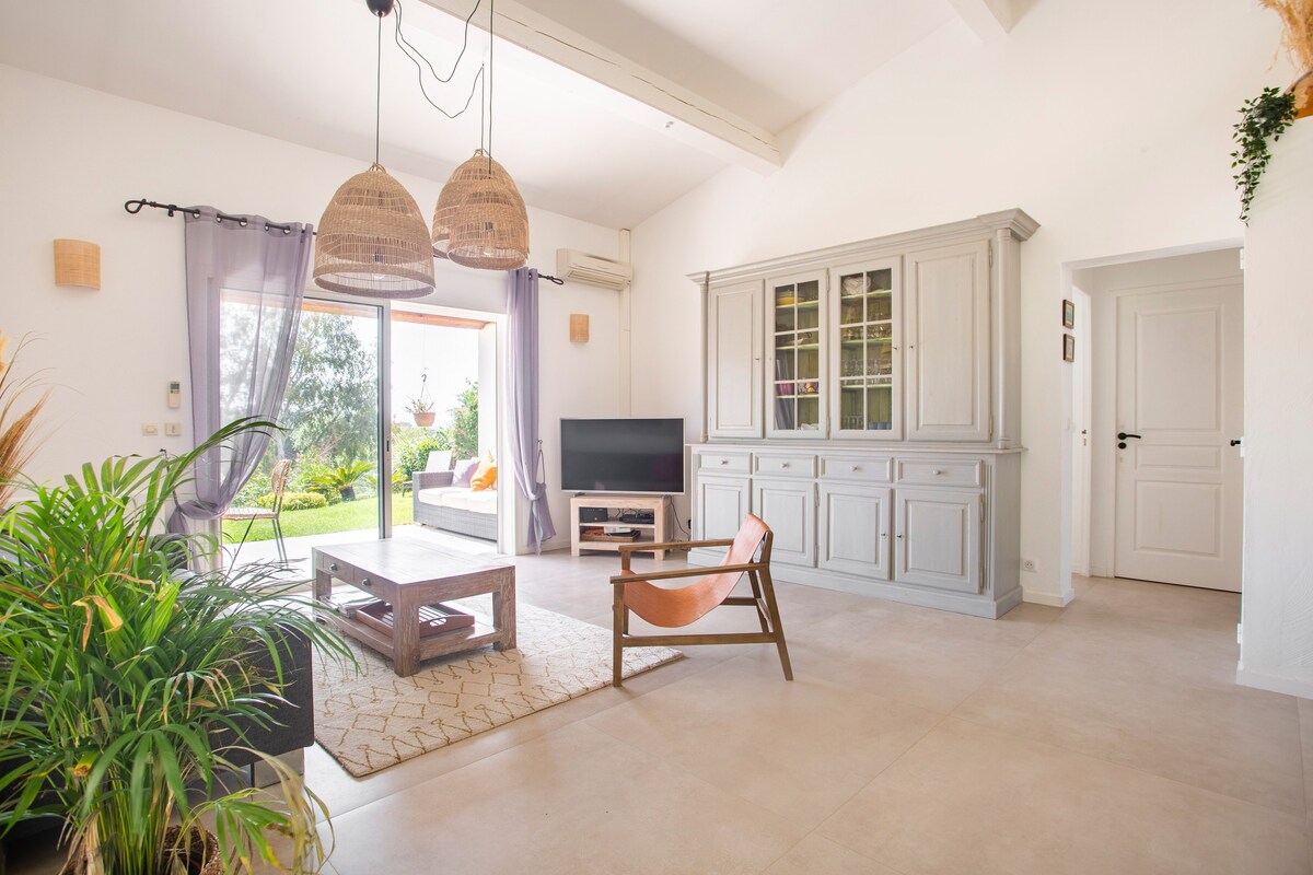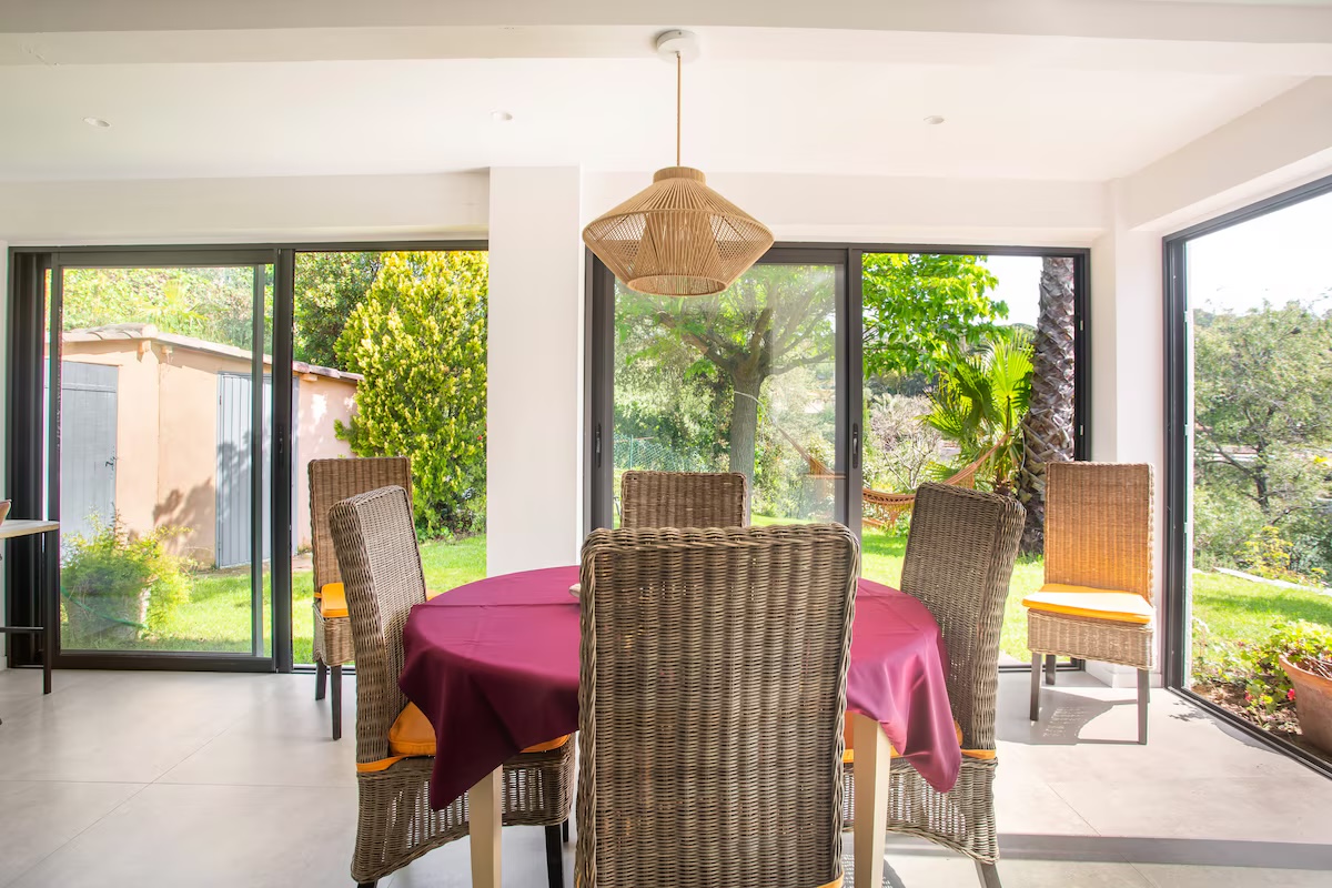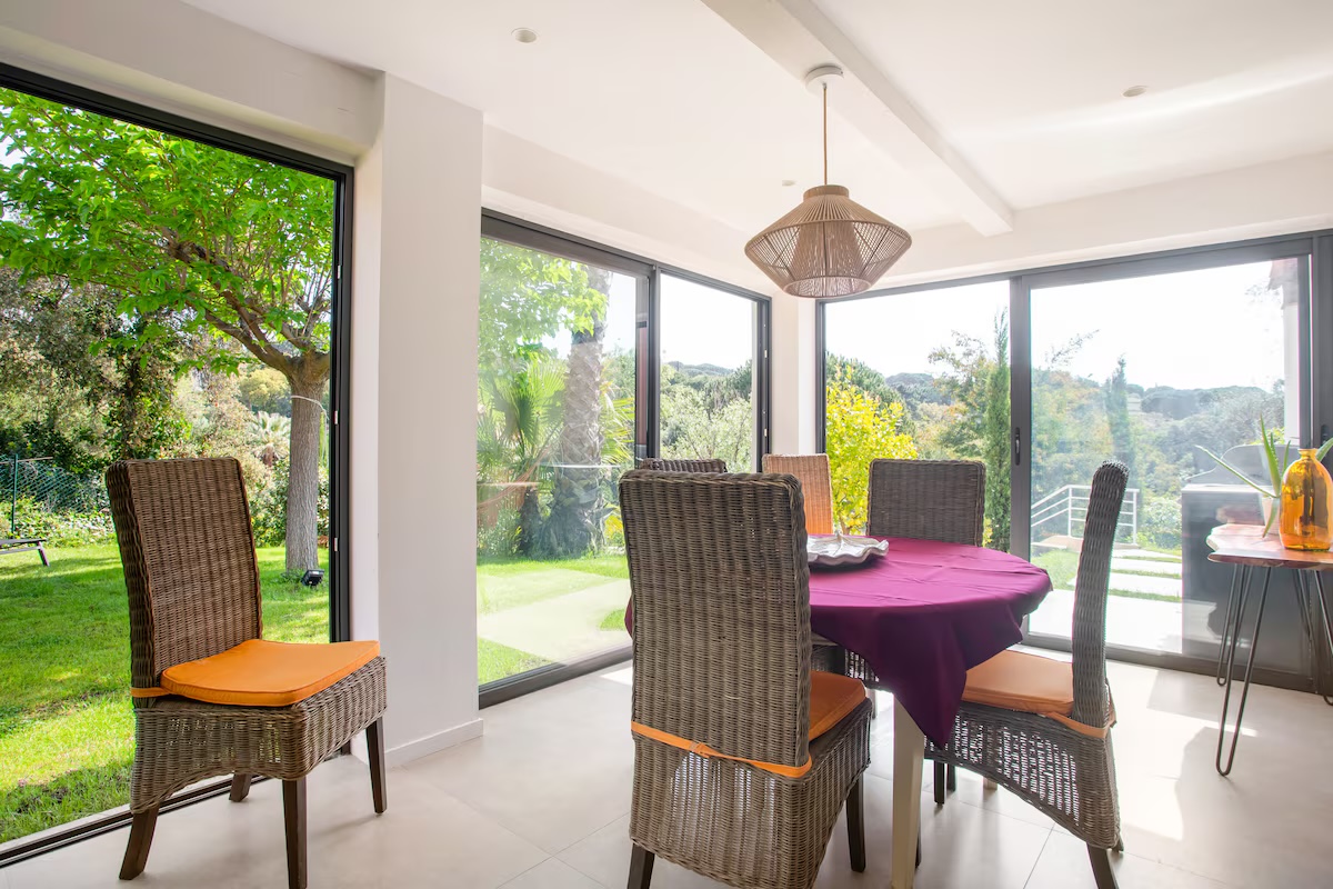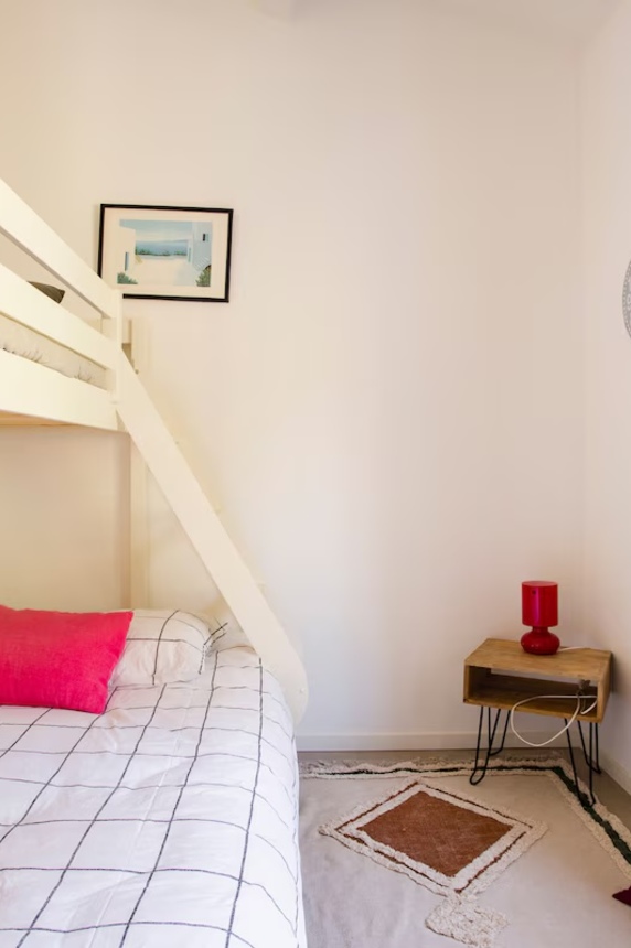 Cette maison familiale rénovée se trouve à Sainte-Maxime, au cœur du golfe de Saint-Tropez. Conçue avec mon père, décorateur d'intérieur, comme un lieu confortable, lumineux et fonctionnel, elle est parfaite pour des vacances en famille ou entre amis. Ses espaces de vie sont spacieux et lumineux. La maison est entièrement climatisée et très lumineuse. Elle dispose d'un grand séjour de 55 m² agréable et convivial, ouvert sur une véranda donnant sur un jardin fleuri. Le mobilier est confortable et adapté aux longs séjours. La cuisine ouverte, organisée autour d'un îlot central, est entièrement équipée. - four et plaque à induction ; - cafetières, bouilloire, grille-pain ; - un robot de cuisine et de nombreux accessoires ; Une terrasse extérieure permet de prendre ses repas dehors et un barbecue Weber est à disposition. Les chambres et la salle de bains La maison offre 5 couchages : - la chambre principale (12 m²) avec un lit queen size (160 x 200), lumineuse et offrant une vue sur le jardin ; - une deuxième chambre (10 m²) avec un lit double superposé (140 x 200 + 90 x 200), idéale pour les enfants ou les invités ; La salle de bains moderne dispose d'une grande douche. Le linge de lit et les serviettes sont fournis. Le jardin et la piscine sont à votre disposition. Le jardin de plus de 300 m², arboré d'oliviers, de palmiers et de citronniers, est parfait pour les familles et les animaux de compagnie. La piscine partagée de la résidence, située à moins de 20 mètres, est très calme (résidence de dix maisons environ). Elle est ouverte toute l'année et praticable de mai à octobre. Elle dispose d'une zone peu profonde adaptée aux enfants. Équipements pour la famille et les loisirs : - équipements pour bébé : lit parapluie, baignoire, table à langer, chaise haute ; - Wi-Fi fibre ; - un espace de travail avec écran et clavier (télétravail) ; - une place de parking abritée et un parking public à proximité ;