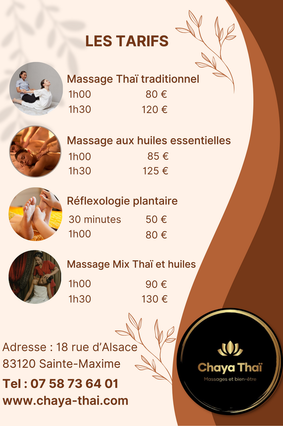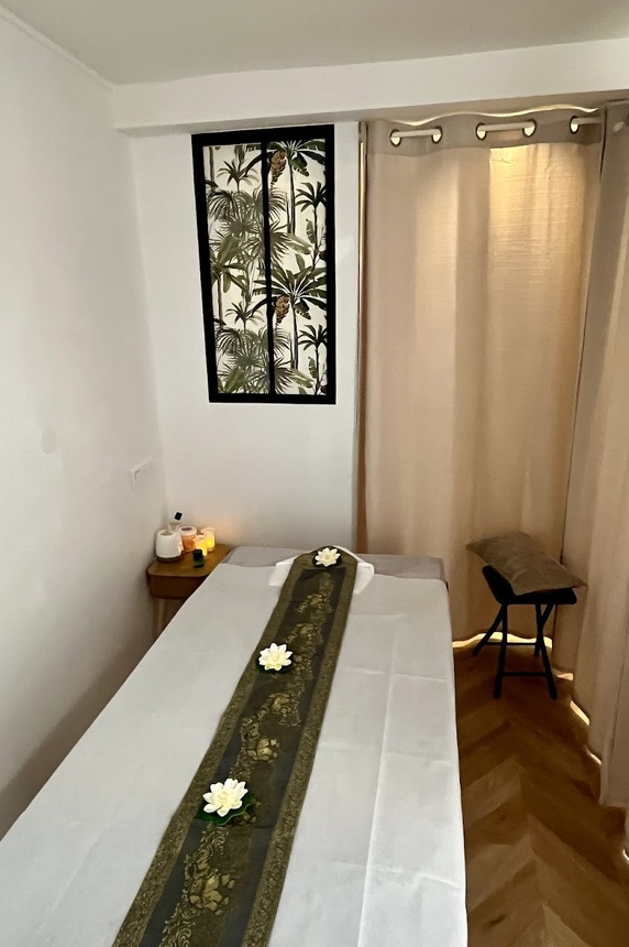 Offrez-vous une parenthèse enchantée, au cœur de la Côte d'Azur, à SainteMaxime. Découvrez l’art ancestral du massage thaïlandais dans un cadre raffiné, chaleureux et intimiste. Chaque soin est une expérience sensorielle unique, pensée pour rééquilibrer votre corps et apaiser votre esprit : - soulage les douleurs - améliore la circulation sanguine et lymphatique - renforce le système immunitaire - efficace contre l'insomnie et la fatigue Notre philosophie : Inspiré par les traditions millénaires de la Thaïlande, notre salon marie le savoir-faire authentique à un accueil haut de gamme. Nos praticiennes, toutes formées en écoles spécialisées en Thaïlande, pratiquent avec précision et bienveillance pour vous offrir un voyage intérieur incomparable. Nos massages : - Massage Thaï Traditionnel : étirages, pressions, alignement énergétique pour une détente en profondeur. - Massage Thaï aux Huiles Essentielles : des manœuvres fluides et enveloppantes pour relâcher les tensions et nourrir la peau. - Réflexologie Plantaire Thaïlandaise : stimulation des zones réflexes pour rééquilibrer les fonctions corporelles. - Massage Mix Thaï et Huiles : une combinaison du massage thaï traditionnel et massage thaï aux huiles CBD. Un Univers Haut de Gamme : - Salles individuelles décorées dans un style thaï moderne et épuré - Linge et huiles premium - Musiques douces et atmosphère olfactive délicate - Service de thé thaï traditionnel après chaque soin Nos services : - Cartes cadeaux disponibles pour offrir un moment d’évasion inoubliable - Formules abonnement pour prolonger les bienfaits toute l’année